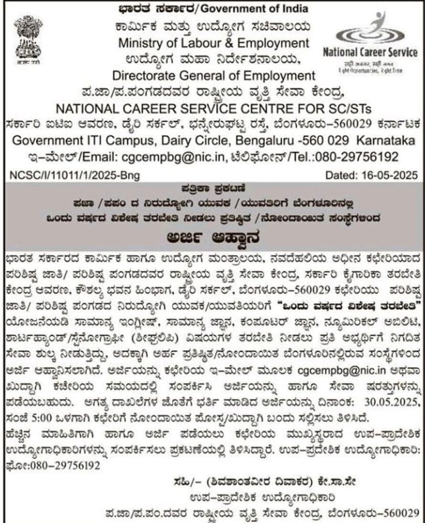 ಭಾರತ ಸರ್ಕಾರದ ಕಾರ್ಮಿಕ ಮತ್ತು ಉದ್ಯೋಗ ಸಚಿವಾಲಯದ ಅಧೀನದಲ್ಲಿ ಕಾರ್ಯನಿರ್ವಹಿಸುತ್ತಿರುವ ಪ.ಜಾ/ಪ.ಪಂಗಡದವರ ರಾಷ್ಟ್ರೀಯ ವೃತ್ತಿ ಸೇವಾ ಕೇಂದ್ರ (NCSC for SC/STs), ಬೆಂಗಳೂರು, ನಿರುದ್ಯೋಗಿ ಪರಿಶಿಷ್ಟ ಜಾತಿ ಮತ್ತು ಪರಿಶಿಷ್ಟ ಪಂಗಡದ ಯುವಕ/ಯುವತಿಯರಿಗೆ ಅವಕಾಶವನ್ನು ಒದಗಿಸಿದೆ.